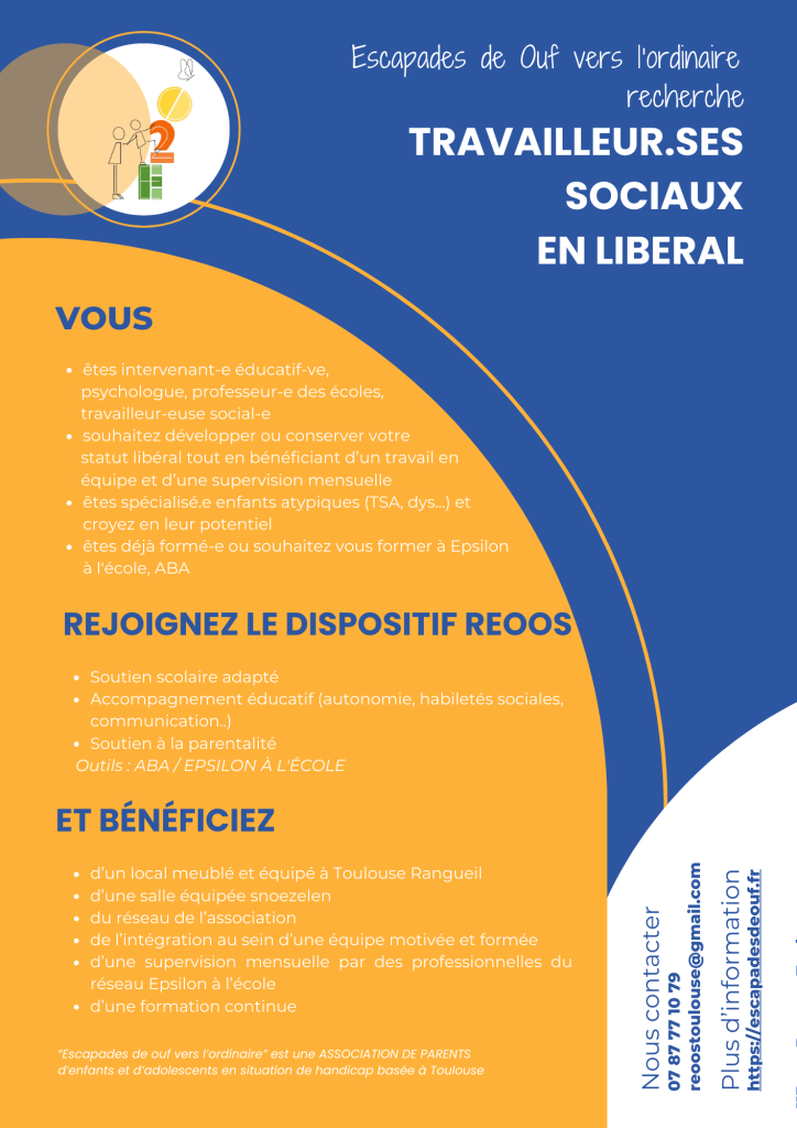 Notre association recherche un ou une libéral.e pour rejoindre REOOS, dispositif innovant d’accompagnement scolaire et éducatif adapté pour les enfants et jeunes à besoins spécifiques.